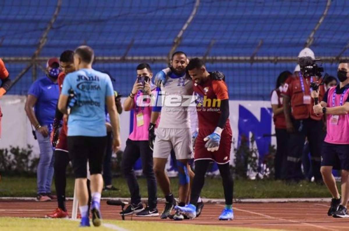 6:15pm Las selecciones de Honduras y Panamá ya salen al campo para realizar el calentamiento. Edrick Menjívar se saludó así con el arquero canalero José Calderón.