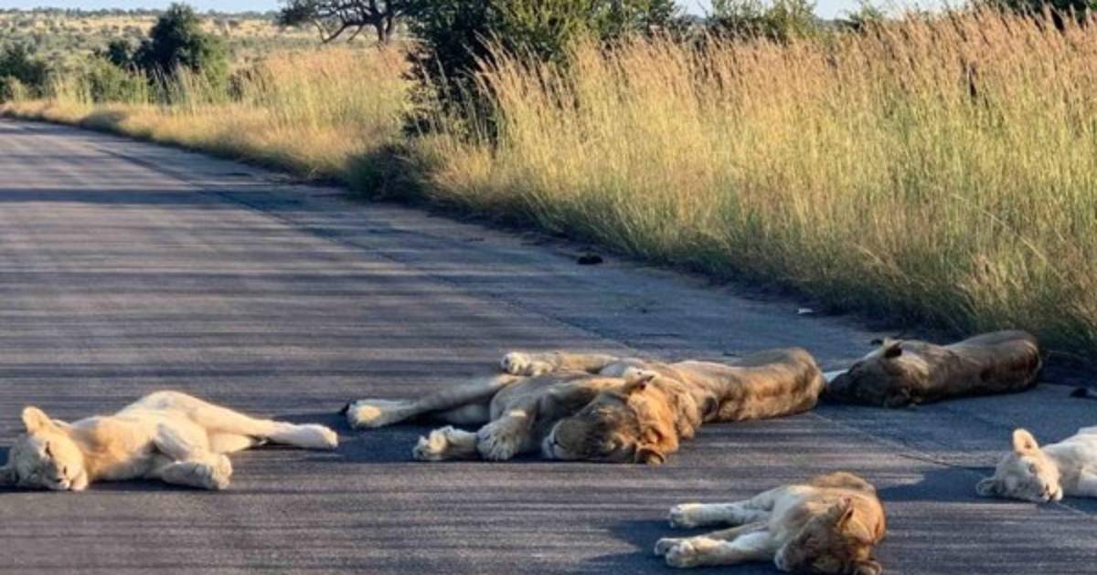 'Este orgullo del león generalmente reside en el Parque Contractual Kempiana, un área que los turistas de Kruger no ven', tuiteó Kruger el miércoles. 'Esta tarde yacían en el camino de alquitrán a las afueras del campamento de descanso de Orpen'.