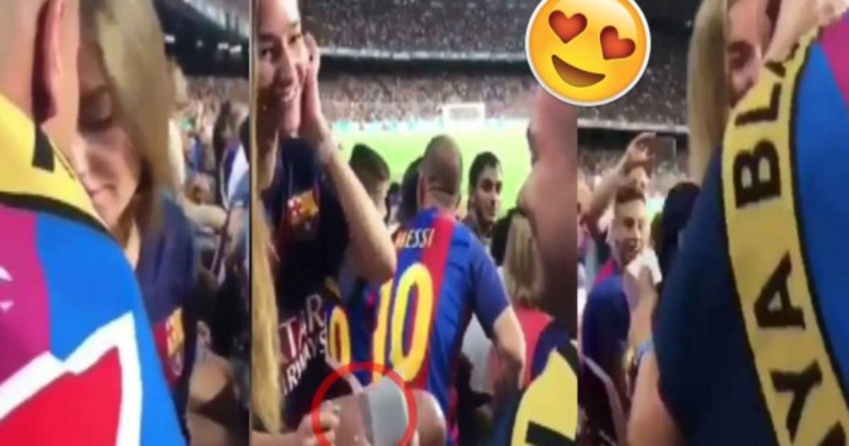 Camp Nou cuando un joven sorprendió a su pareja al pedirle matrimonio.