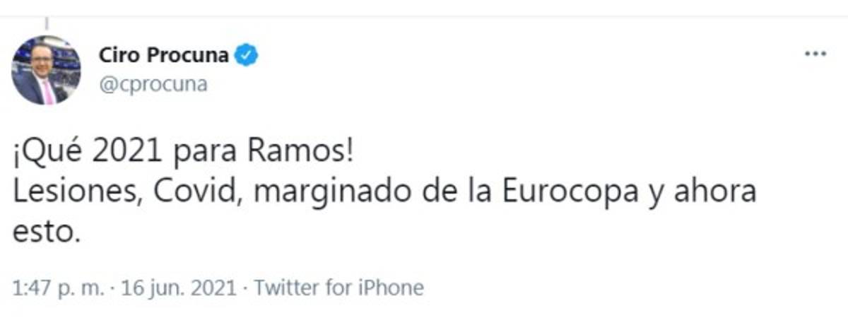 2 / 16Ciro Procuna, periodista de ESPN, señaló todo lo que le ha sucedido al jugador en el presente año. ¡Qué 2021 para Ramos! Lesiones, Covid-19, marginado de la Eurocopa y ahora esto''. -