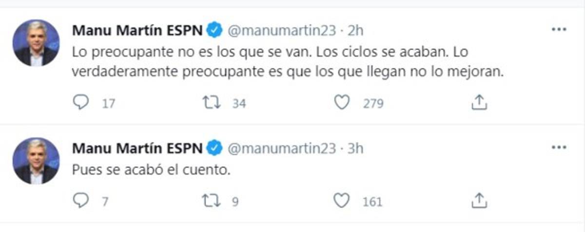 7 / 16Manu Martín, analista de ESPN, escribió un par de tuis tras confirmarse la salida de Ramos. ''Pues se acabó el cuento''. ''Lo preocupante no es los que se van. Los ciclos se acaban. Lo verdaderamente preocupante es que los que llegan no lo mejora''. -