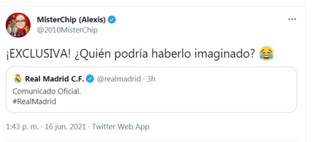 13 / 16Real Madrid confirmó que Ramos se marcha del equipo y Mister Chip vaciló con sus miles de seguidores. ''¡Exclusiva! ¿Quién podría haberlo imaginado?'', preguntó el famoso estadígrafo español añadiendo un emoji de risas. -
