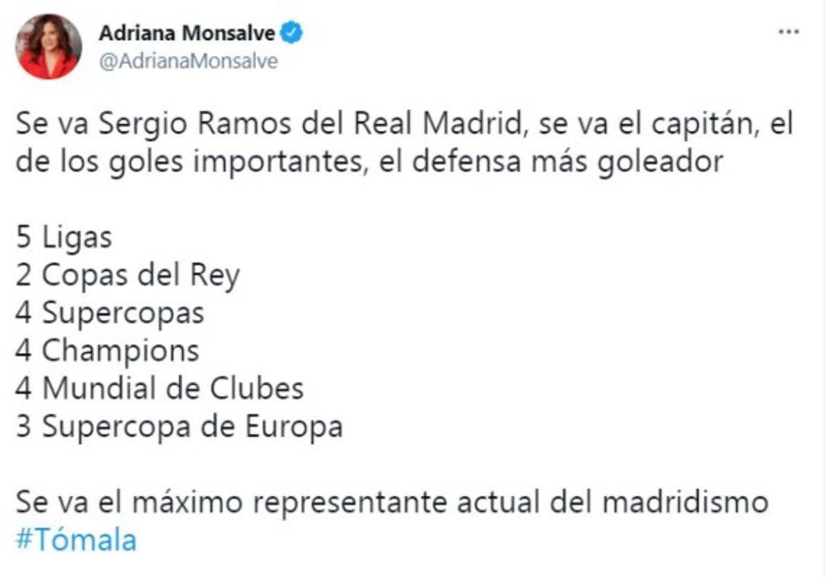 3 / 16La reportera de TUDN, Adriana Monsalve, enumeró todo lo que consiguió Ramos con los blancos. ''Se va el capitán, el de los goles importantes, el defensa más goleador. 5 ligas, 2 Copas del Rey, 4 Supercopas, 4 Champions, 4 Mundiales de Clubes, 3 Supercopas de Europa. Se va el máximo representante actual del madridismo. Tómala'', escribió. -