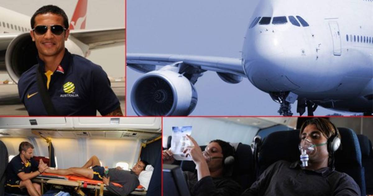 El capitán Tim Cahill en vuelo directo desde Sídney a Qatar recibe un tratamiento para evitar una fatiga muscular.