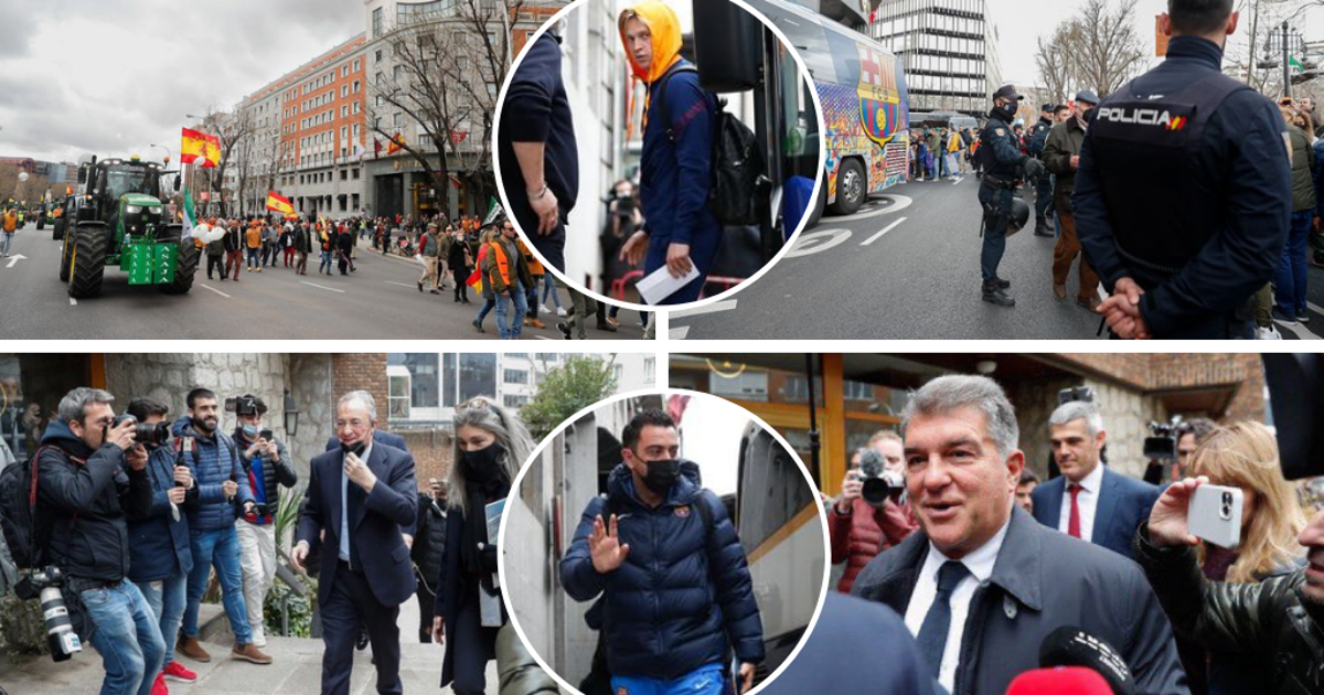 ¡Tractores en la calle! Así fue la caótica llegada de Barcelona al hotel y la pregunta que no quisieron responder Laporta y Florentino
