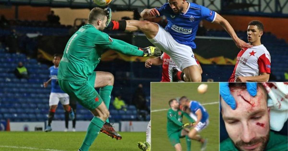 El portero del Slavia Praga, Ondrej Kolar, salió con graves heridas en su rostro tras ser impactado por el delantero del Rangers de Escocia