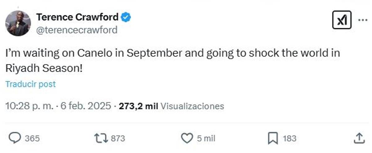 6 / 16“Estoy esperando al Canelo en septiembre y sorprenderé al mundo en la temporada de Riad”, expresó Crawford.