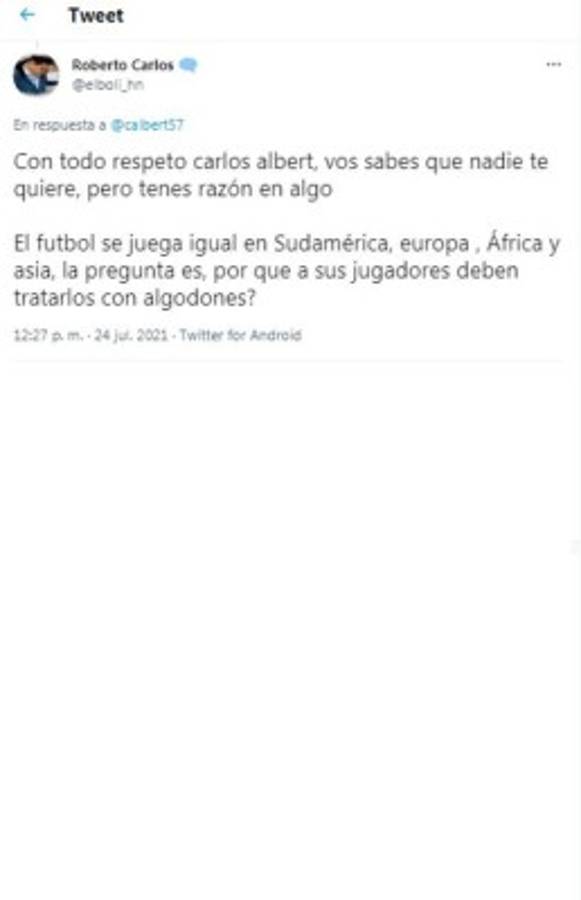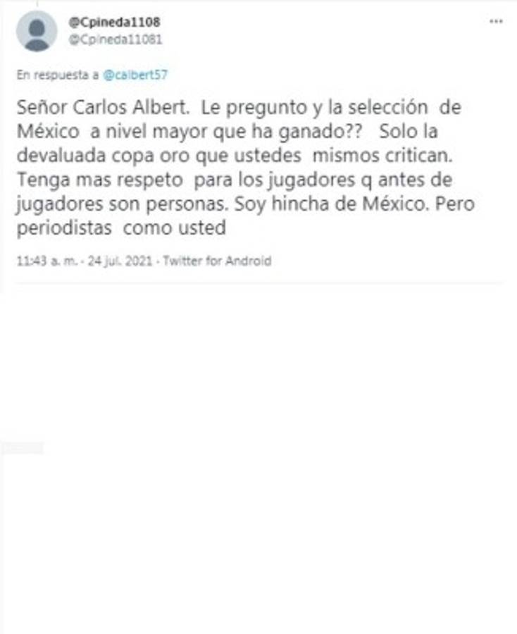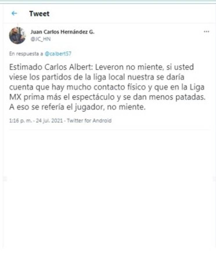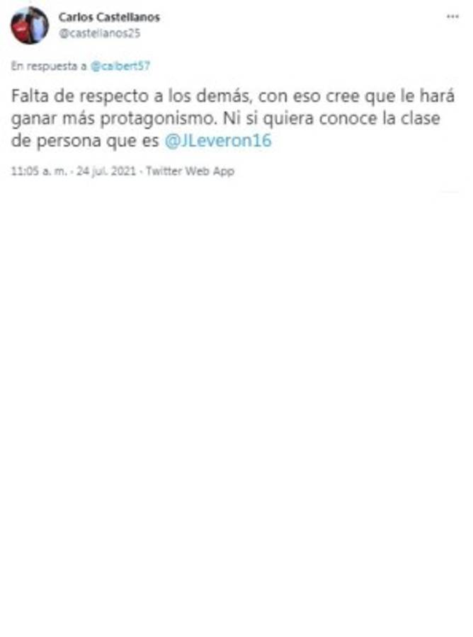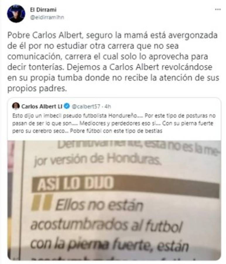 Carlos Albert atacó a Leverón: 'Esto dijo un imbécil pseudo futbolista hondureño. Por este tipo de posturas no pasan de ser lo que son mediocres y perdedores, eso si, con su pierna fuerte, pero su cerebro seco. Pobre fútbol con este tipo de bestias', atacó el periodista. Tras eso le cayeron las avispas en redes sociales y lo criticaron de forma dura.