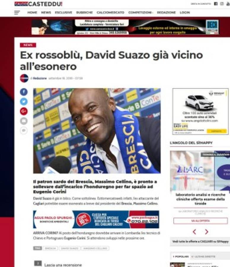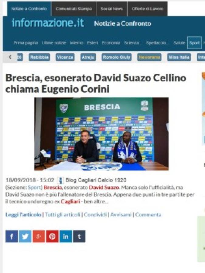 7 / 15EliveBrescia - Detalla lo ocurrido antes de la salida de David Suazo. 'Se dijo que el presidente estaba muy enojado y decepcionado por el empate contra Pescara el sábado y se suma la eliminación en la Copa de Italia, que no le gustó para nada. Al estilo de Massimo Cellino, David Suazo fue destituido incluso antes de que pueda jugar sus últimas cartas'. -
