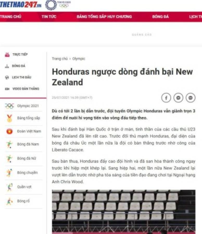 13 / 15El portal Thethao de Vietnam detaca el triunfo de Honduras sobre Nueva Zelanda de forma épica porque fue remontada. -