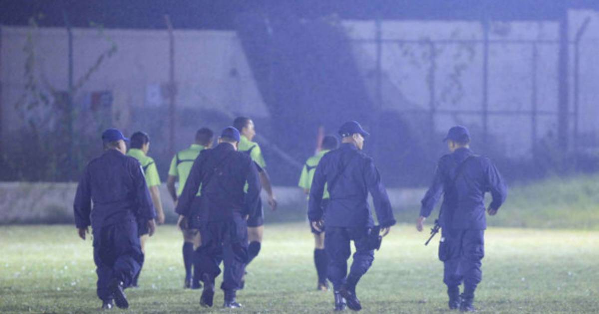 1 / 26José Ulloa arbitro central y su terna son escoltados por miembros de la policías al final del juego en Santa Cruz de Yojoa. -