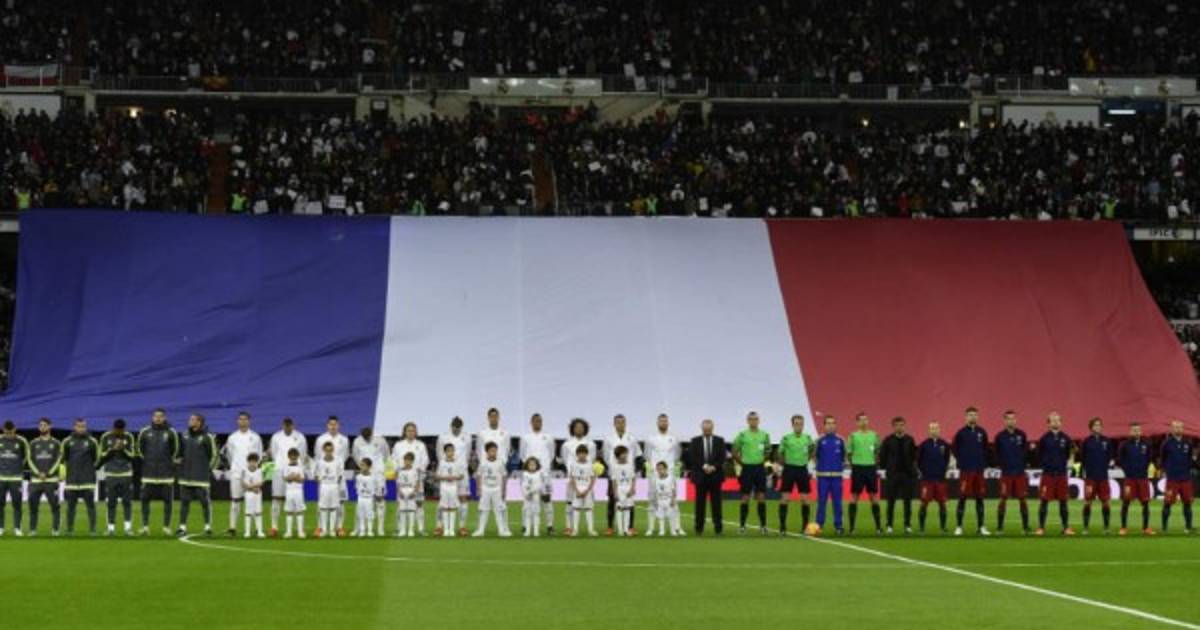 5 / 8Antes del Clásico, se hizo un minuto de silencio, se desplegó una bandera en la grada y se escuchó el himno nacional de la República Francesa.(AFP) -