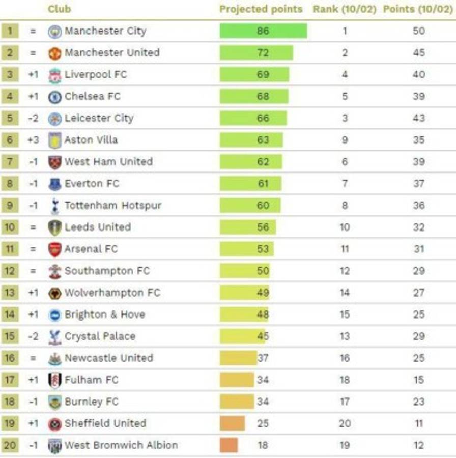9 / 12En la Premier League de Inglaterra ganaría el que se espera: Manchester City. Y además lo haría sobrado, con 14 puntos de ventaja sobre el segundo, el Manchester United. -