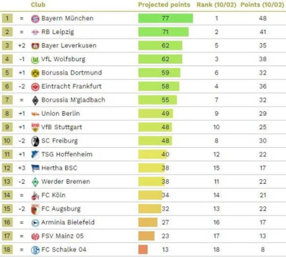 3 / 12Así quedará la tabla de posiciones de Liga de Alemania al final de temporada, según este estudio realizado. Solo por seis puntos el Bayern va a superar al Leipzig en la tabla de posiciones. -
