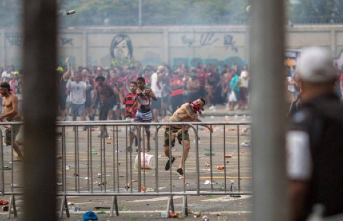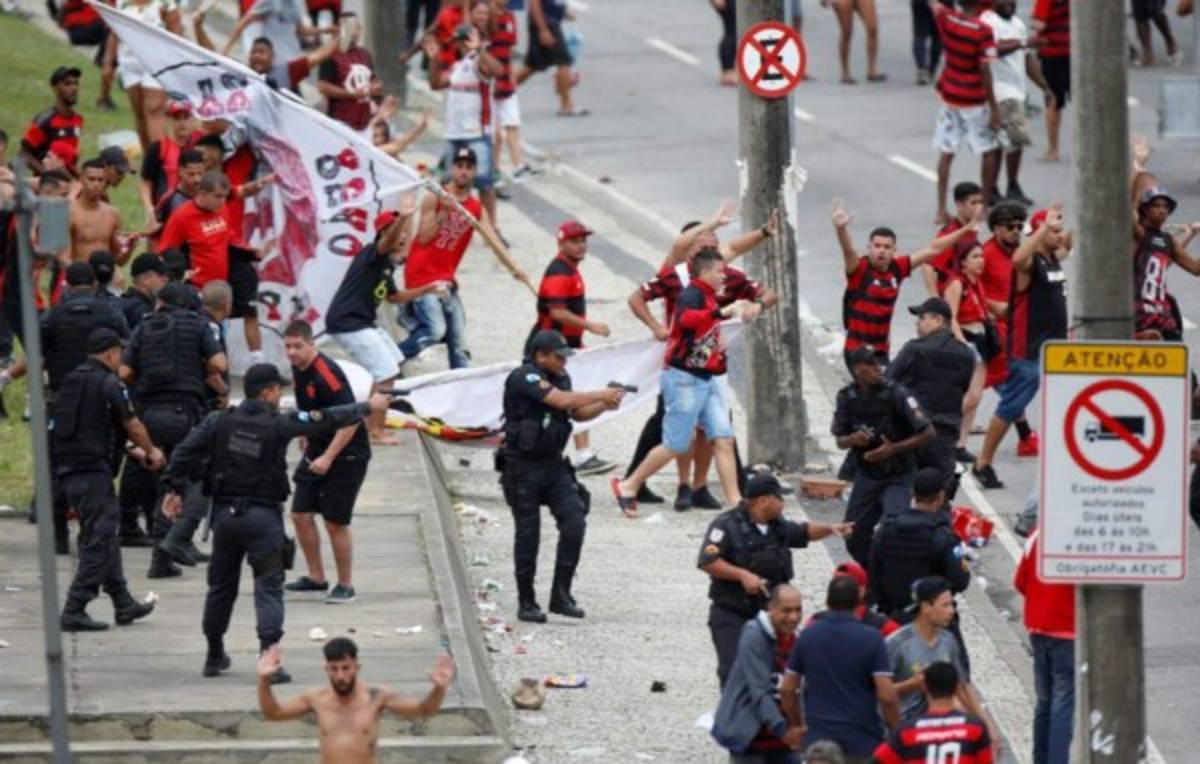 5 / 15Los hinchas del 'Fla' tuvieron un enfrentamiento con la policía en pleno festo donde hubo, pelea, disturbio y disparos. -