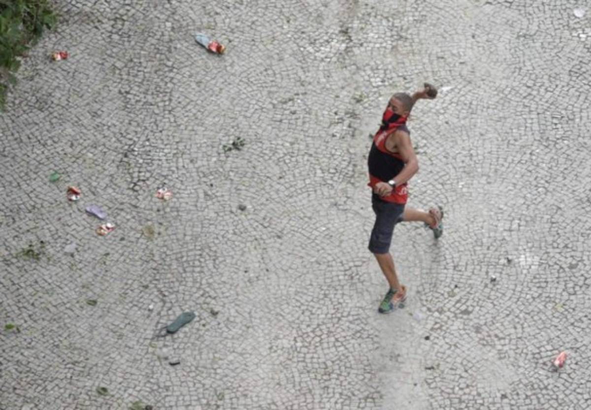 10 / 15Este aficionado se defiende con piedras ante la policía que disparaba contra ellos. -