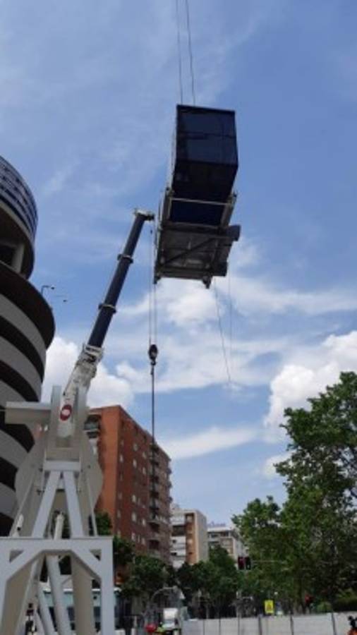 7 / 17La cubierta de los dos fondos ya están retiradas y se han empezado a levantar las nuevas torres de acceso en el lateral oeste del estadio (Paseo de la Castellana), sobre las que se apoyará la nueva cubierta que contará con el techo retráctil. -