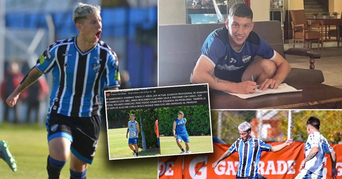 5 / 16"Soy Gian Franco Joannaz, tengo 21 años, soy actual jugador profesional de Almagro, sin chances este año. Ando buscando club para salir a préstamo sin cargo. Soy lateral-volante derecho, pero puedo jugar por izquierda sin problemas también. El que sepa de algo, me chifla, busco rodaje para este año. ¡Mensajes al privado!", pubicó por Facebook.