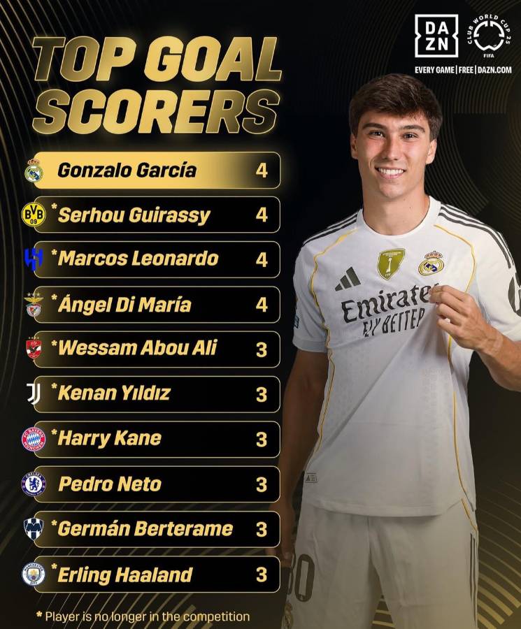 2 / 17Gonzalo García, delantero español del Real Madrid, cierra el Mundial de Clubes como máximo goleador con cuatro tantos, en un galardón compartido con el argentino Ángel Di María del Benfica, el guineando Serhou Guirassy del Borussia Dortmund y el brasileño Marcos Leonardo de Al Hilal.