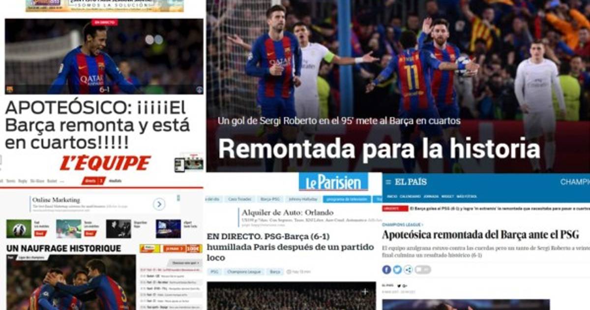 1 / 16La prensa mundial se rinde al Barcelona y no encuentran la forma en la que el Barcelona logró remontar un 4-0 y pasar a cuartos de final de la Champions. -