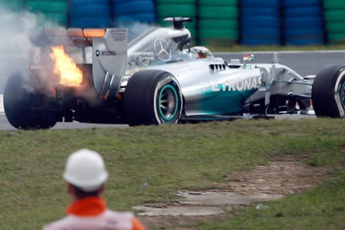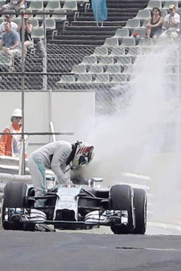 11 / 22El coche del británico de Fórmula Uno Lewis Hamilton de Mercedes AMG GP está en llamas durante la sesión de calificación en el circuito de Hungaroring en Mogyorod, cerca de Budapest, Hungría, EFE. -
