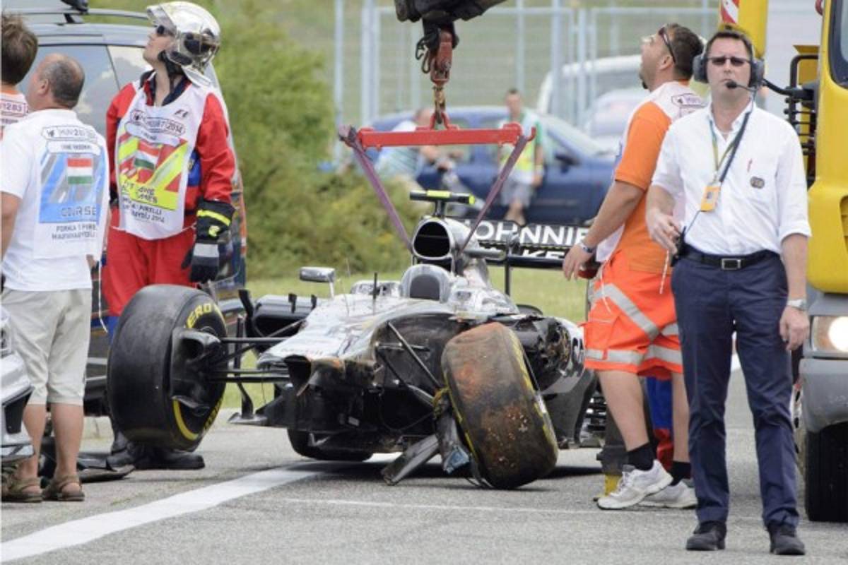 22 / 22Los restos del coche del danés Kevin Magnussen, de McLaren, se recupera de la pista después de que se estrelló durante la sesión de clasificación en el circuito de Hungaroring en Mogyorod, EFE.