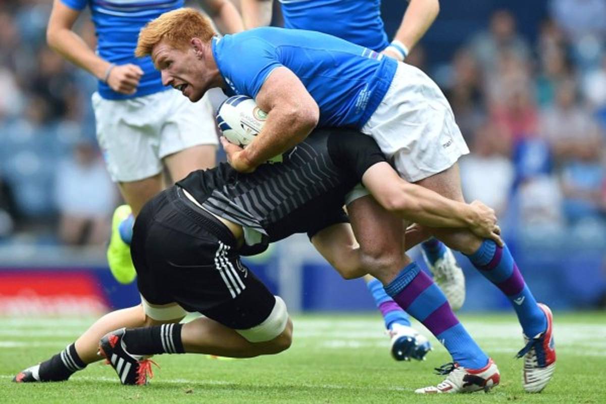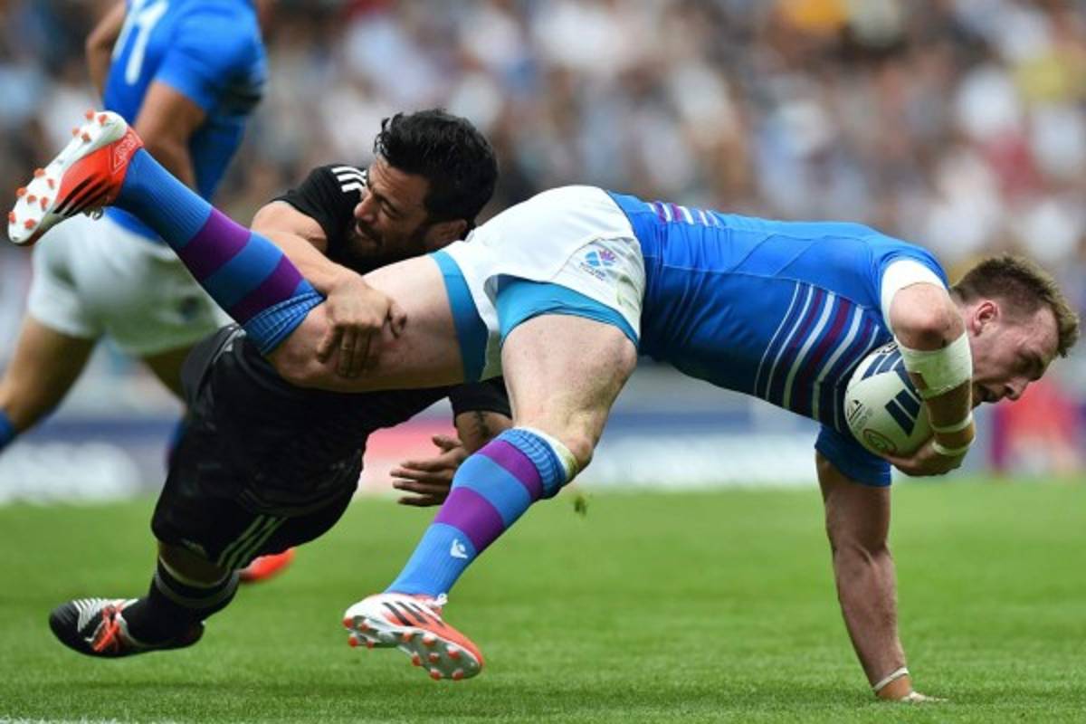 6 / 22Sherwin Stowers de Nueva Zelanda lucha con Stuart Hogg de Escocia en los juegos de Rugby Grupo A partido entre Escocia y Nueva Zelanda en el Ibrox Stadium durante los Juegos de la Commonwealth 2014 en Glasgow. Foto AFP -