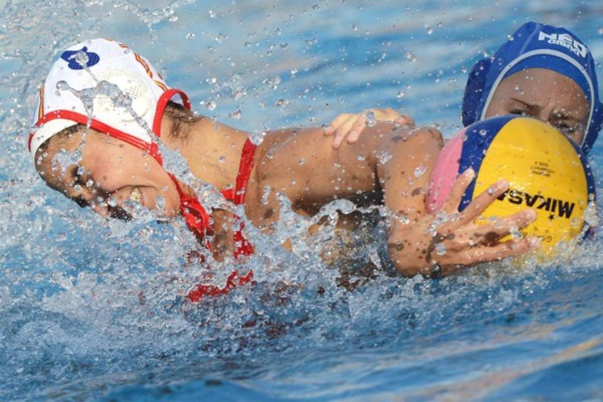 2 / 22María Carmen García Godoy de España en la lucha contra Dagmar Rixt Genee de los Países Bajos durante el partido de la final femenina entre Holanda y España en el Campeonato Europeo de Waterpolo.Foto EFE. -