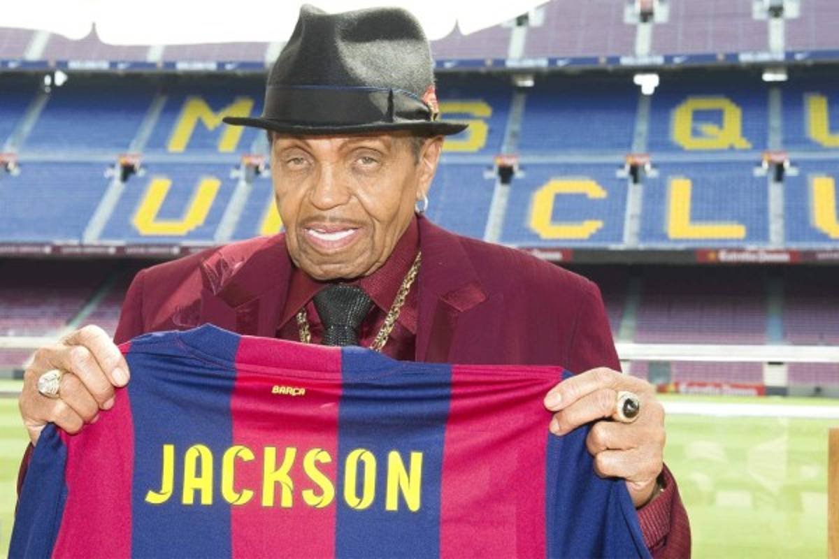 21 / 22FotografÌa facilitada por el FC Barcelona del padre del difunto Michael Jackson, Josep Walter Jackson, que posa con una camiseta con su nombre durante la visita que ha realizado hoy a las instalaciones del club. EFE -