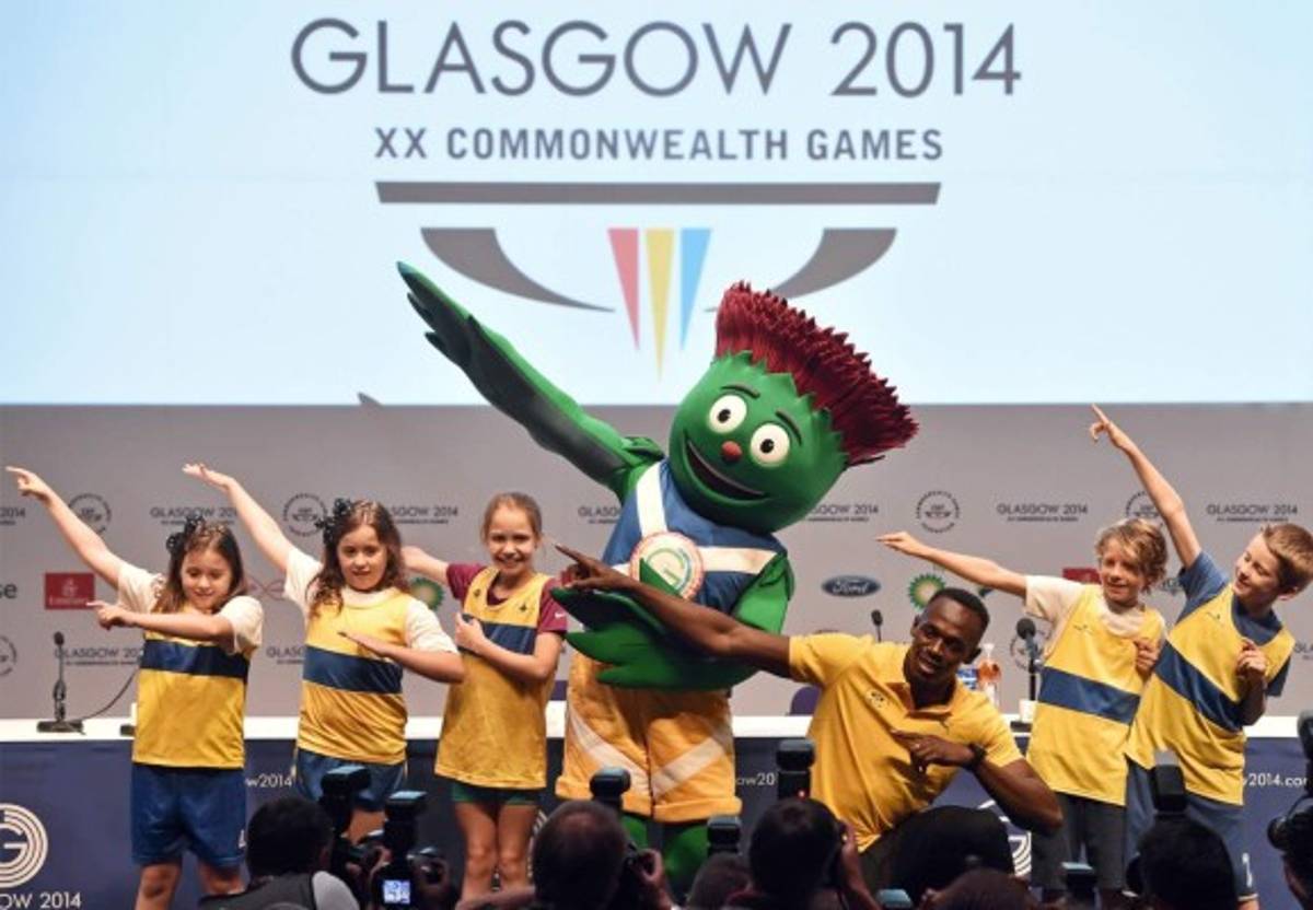 8 / 22El atleta de Jamaica Usain Bolt (tercero ) posa para una foto con la mascota de los Juegos Clyde y niños durante una conferencia de prensa en los Juegos de la Commonwealth de 2014 en Glasgow, Escocia, AFP. -