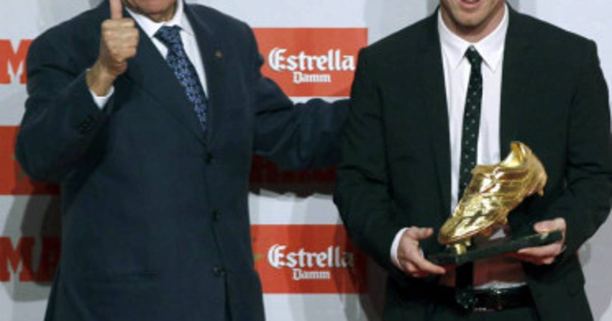 8 / 20El director del diario Marca, Oscar Campillo muestra una botita de oro antes de dársela a Lionel Messi. -