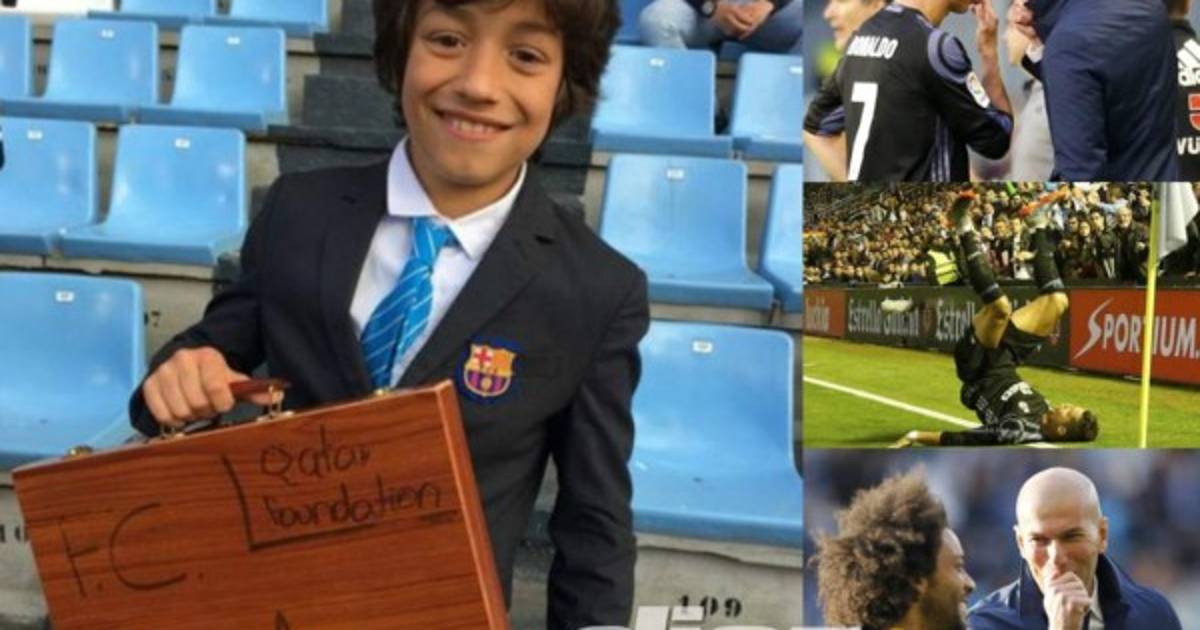 5 / 18Este niño se llevó todas las cámaras al llevar consigo un maletín haciendo alusión de los 3 millones de euros que habría ofrecido el Barcelona al Celta para vencer al Real Madrid. -