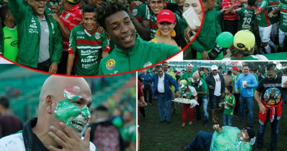 7 / 15El momento en el que los jugadores verdes llenan el rostro de pastel a Maní Suazo. -