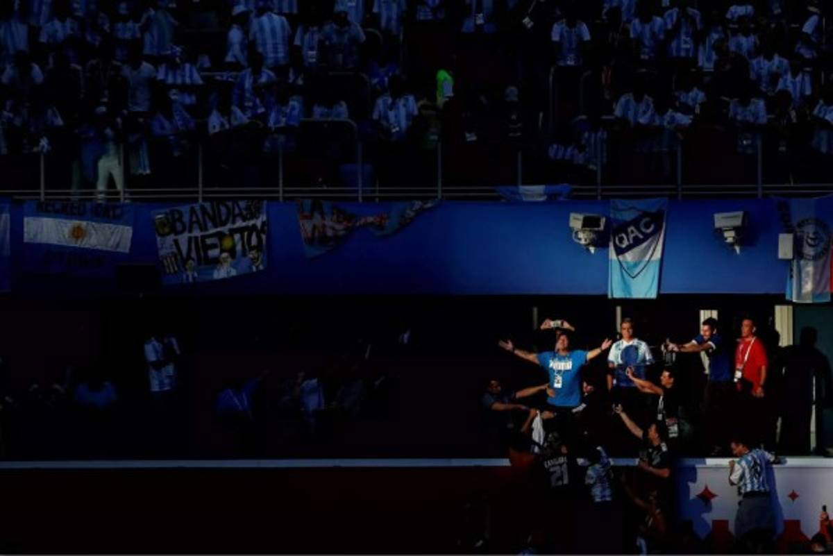 Luego del gol de Messi, Maradona inmortalizó una de las mejores imágenes del Mundial cuando celebrando levanto sus manos agradeciendo a Dios.