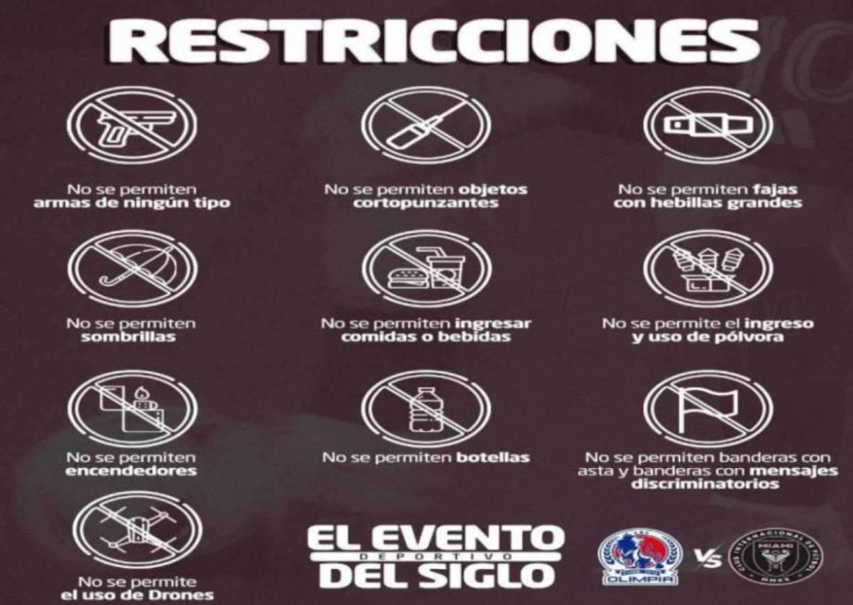 16 / 16No se permiten armas de ningún tipo, objetos corto punzantes, fajas con hebillas grandes, sombrillas, ingreso con comidas y bebidas, ingreso y uso de pólvora, encendedores, botellas, mantas y banderas con mensajes discriminatorios, además de uso de Drones.