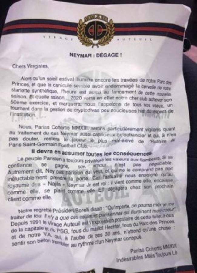 9 / 12En el sector ultra del Parque de los Príncipes se pudo ver una pancarta con un mensaje para el brasileño. 'Neymar, vete ya', decía. -
