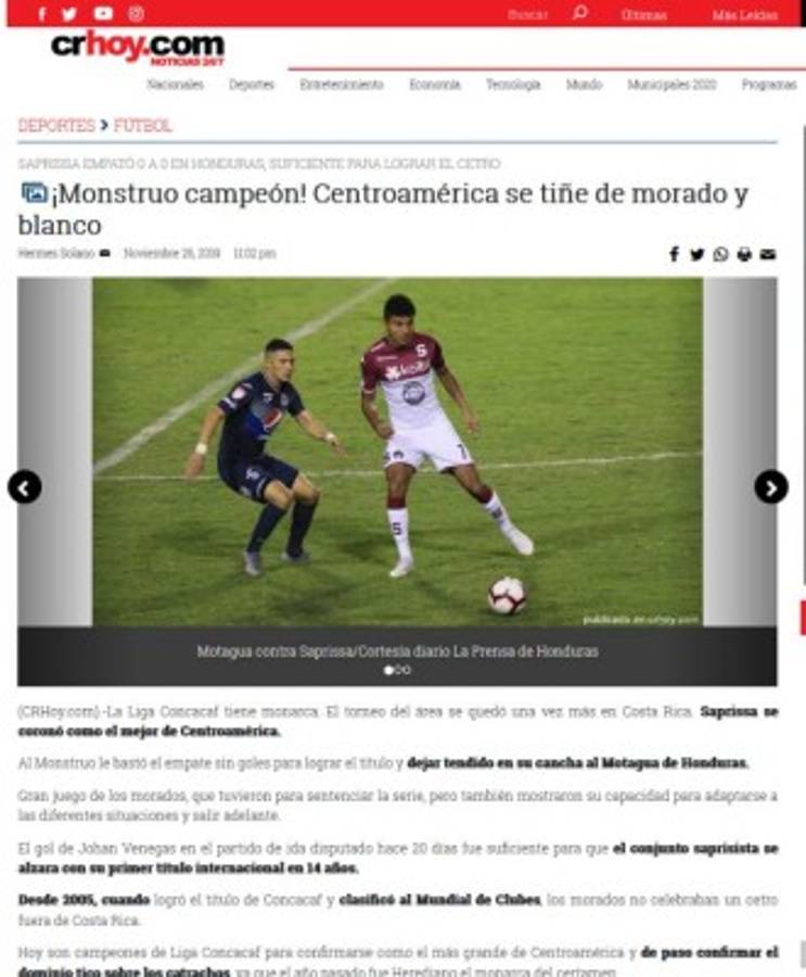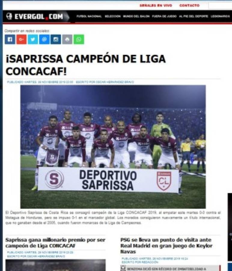 1 / 12Saprissa se coronó campeón de Liga Concacaf del área tras empatar 0-0 con Motagua en el Estadio Nacional. Esto dicen los medios costarricenses y de otras latitudes tras ello. -