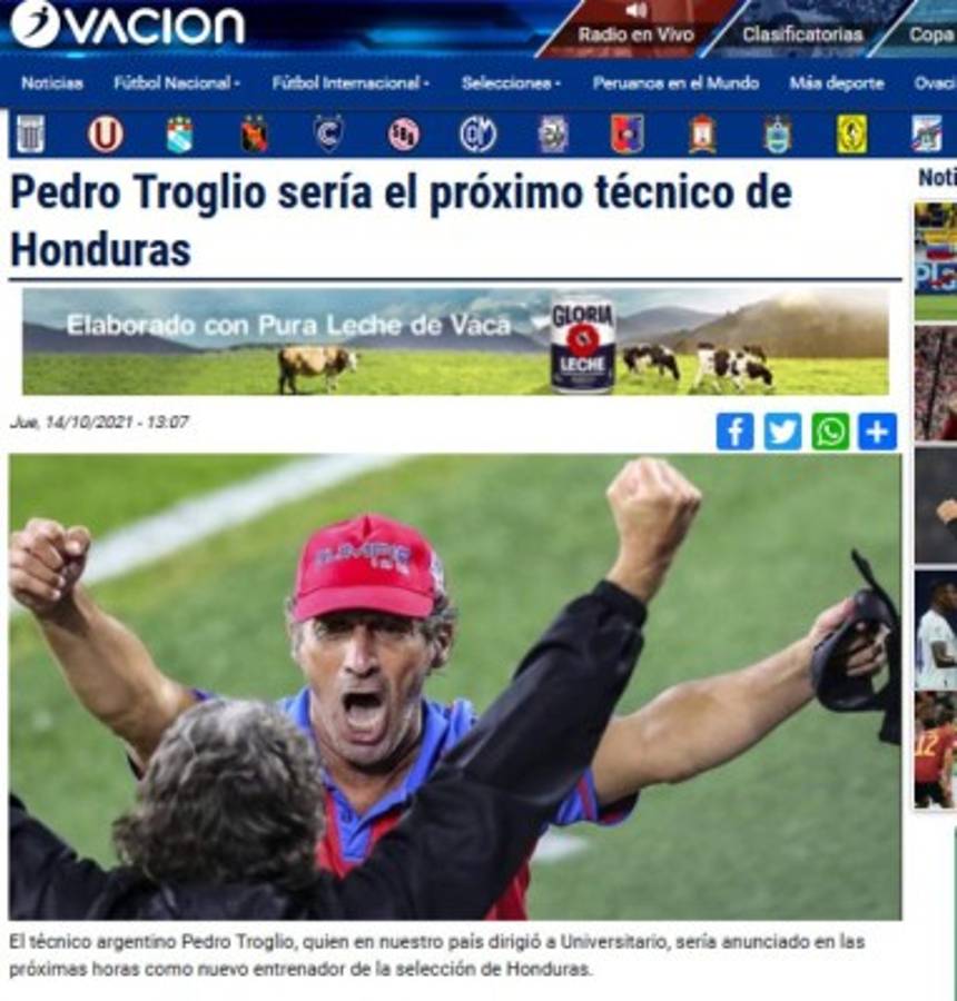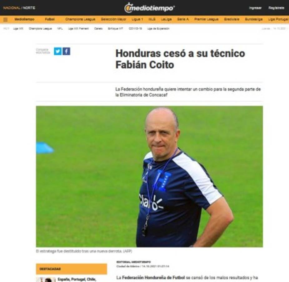 9 / 20Mediotiempo - 'Honduras cesó a su técnico', informó el portal mexicano asegurando que la Fenafuth 'quiere un cambio' para el resto del octagonal. -
