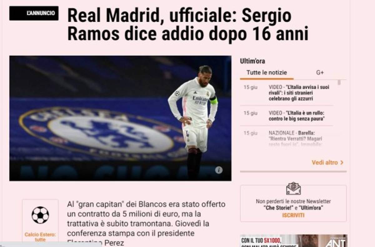 14 / 20El diario italiano La Gazzetta Dello Sporte dijo lo siguiente: 'Real Madrid, oficial; Sergio Ramos dice adiós después de 16 años'. -