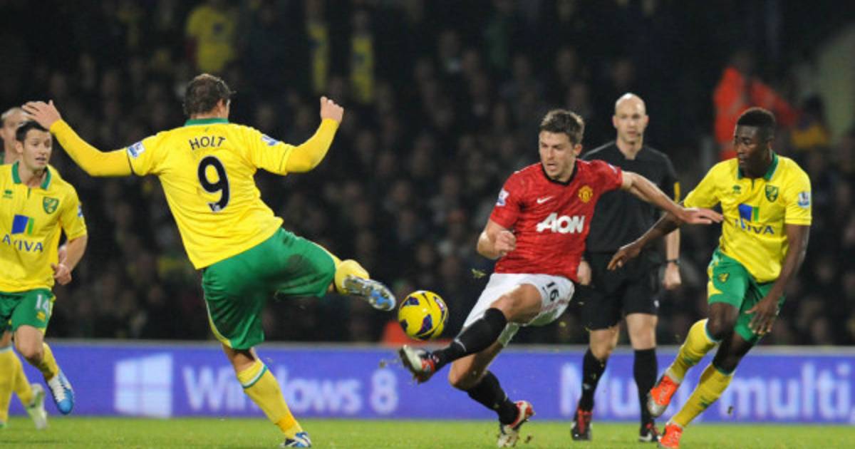 1 / 21Inglés centrocampista del Manchester United Michael Carrick compite con Inglés Norwich City Holt delantero Grant -