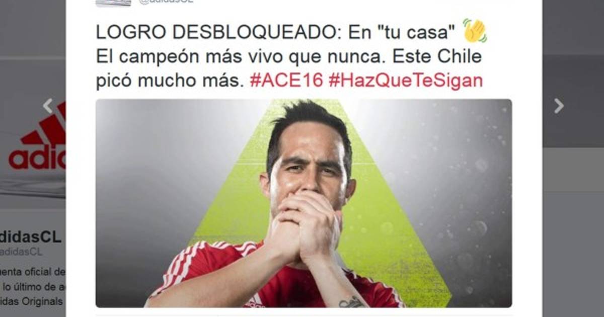 A través de la red social de Twitter, Adidas publicó una imagen en formato GIF donde aparece Claudio Bravo llevándose las manos a la boca y luego simula llorar.