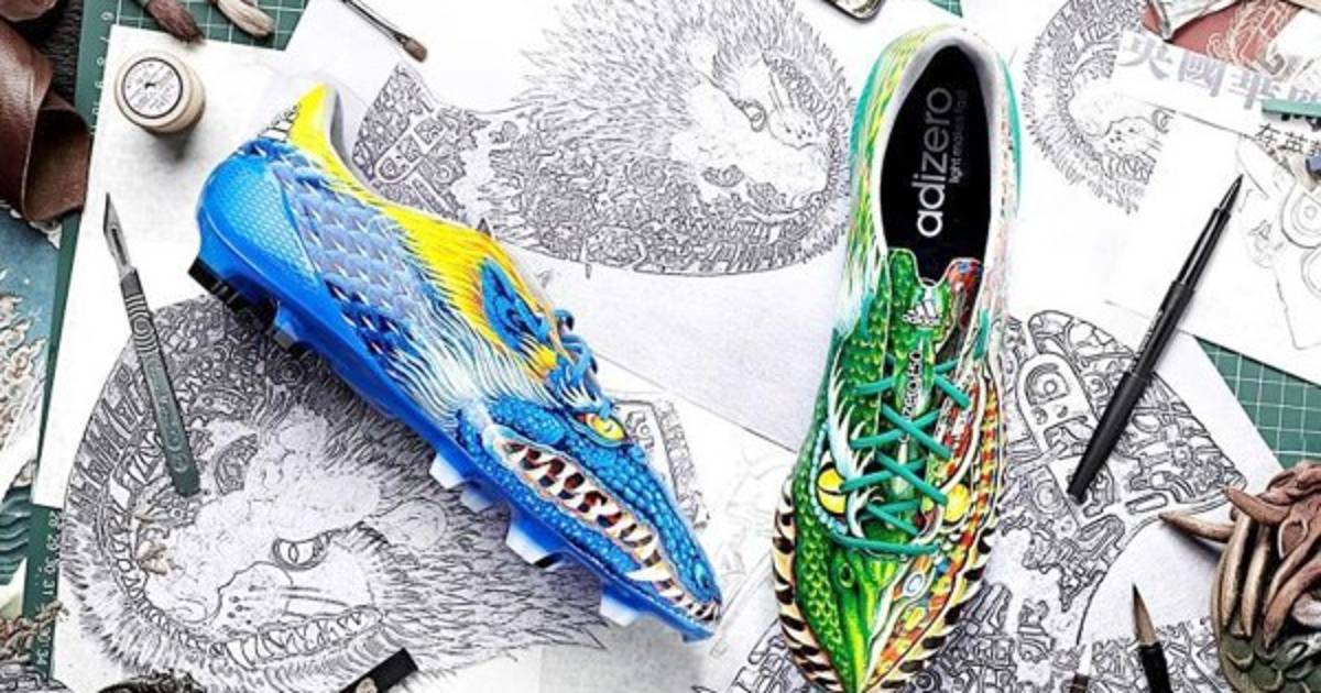 Los tacos son de colores diferentes el lado izquierdo es color verde y el derecho es de color azul, la parte frontal del calzado muestra un par de dragones inspirados en la tercera equipación del Real Madrid y por la cultura y ciencia ficción de Japón.