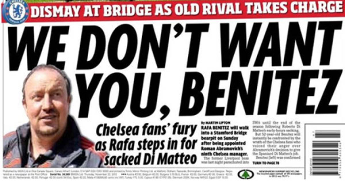 Rafa Benítez llega al “manicomio”, según cuentan varios medios ingleses, en el que se ha convertido Stamford Bridge, que ha visto pasar a cinco entrenadores en los últimos doce años. Los aficionados han mostrado su enfado con la contratación del técnico español e incluso el director de la revista oficial del club, Dave Johnstone, se ha mostrado contrario a la decisión.