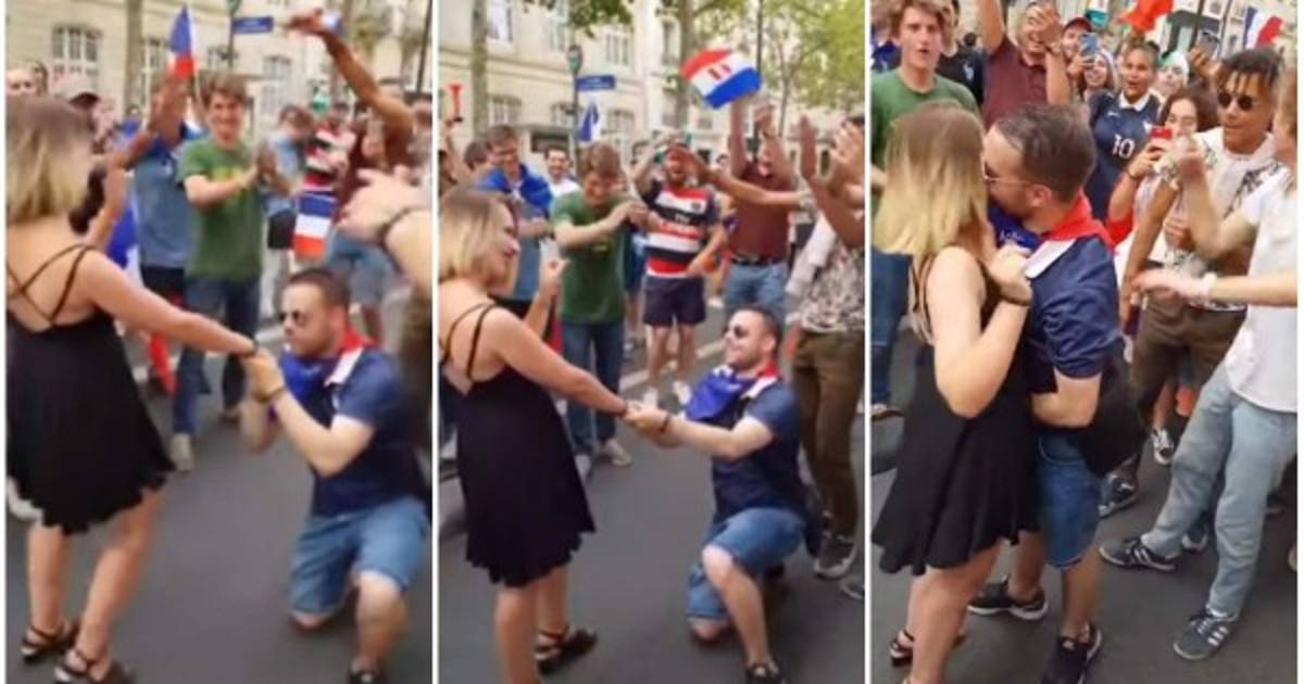 Al finalizar el encuentro un aficionado vestido con la camisa de Francia se puso de rodillas y le propuso a su acompañante que se case con él, mientras ella con el dedo decía que no y levantó a su novio.