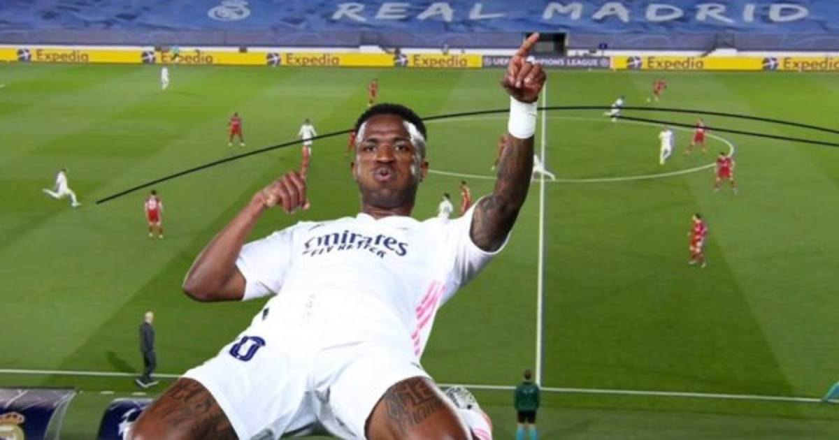 La jugada del sudamericano tuvo lugar después de un gran pase largo, más de 65 metros, del alemán Toni Kroos para dejarlo de frente al guardameta Alisson Becker.