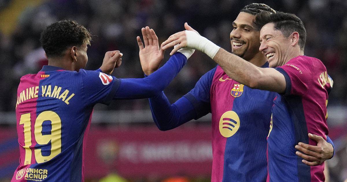 El Barça ya mandaba a placer a la media hora y aún pudo hacer el tercero antes del descanso en otra jugada por la derecha de Lamine Yamal que acabó con un remate de Pedri que el meta visitante desvió a córner.