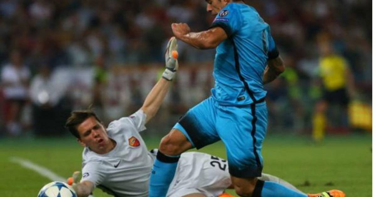 La jugada fue en el minuto 23 del partido cuando el árbitro holandés Kuipers no le pitó una falta penal a Luis Suárez cuando fue derribado por el portero de la Roma Szczesny.