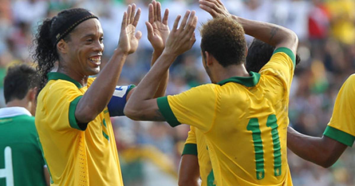 La magia de Ronaldinho, un doblete de Neymar y sendos tantos de Leandro Damiao y Leandro Moura dieron hoy a la selección brasileña una aplastante victoria por 0-4, la primera en la nueva era de Luiz Felipe Scolari en el banquillo, a costa de Bolivia en un partido amistoso jugado en la Santa Cruz de la Sierra.