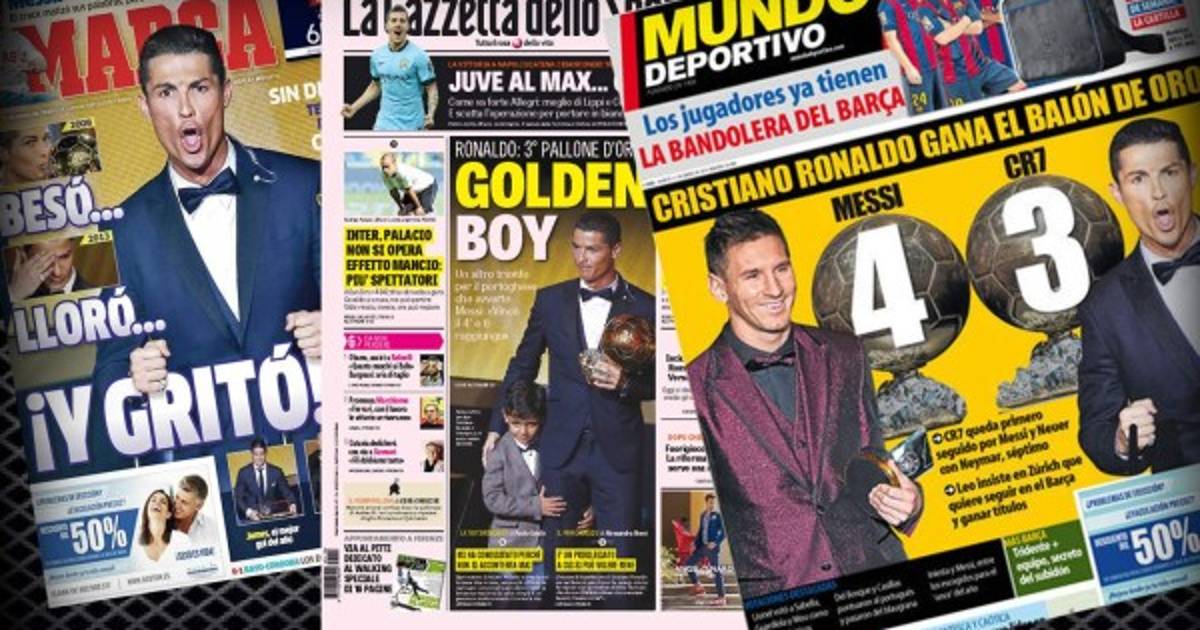 El delantero del Real Madrid, Cristiano Ronaldo, ganador del Balón de Oro 2014, acaparó todas las portadas de los diarios de más interés en el mundo.