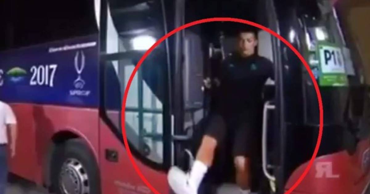 CR7 bajaba del autobus cuando el Real Madrid llegaba a reconocer la cancha del estadio Filip II de Skopie en Macedonia. Pero algo salió mal. una de las alfombras le jugó una mala pasada a la estrella portuguesa y casi se cae.